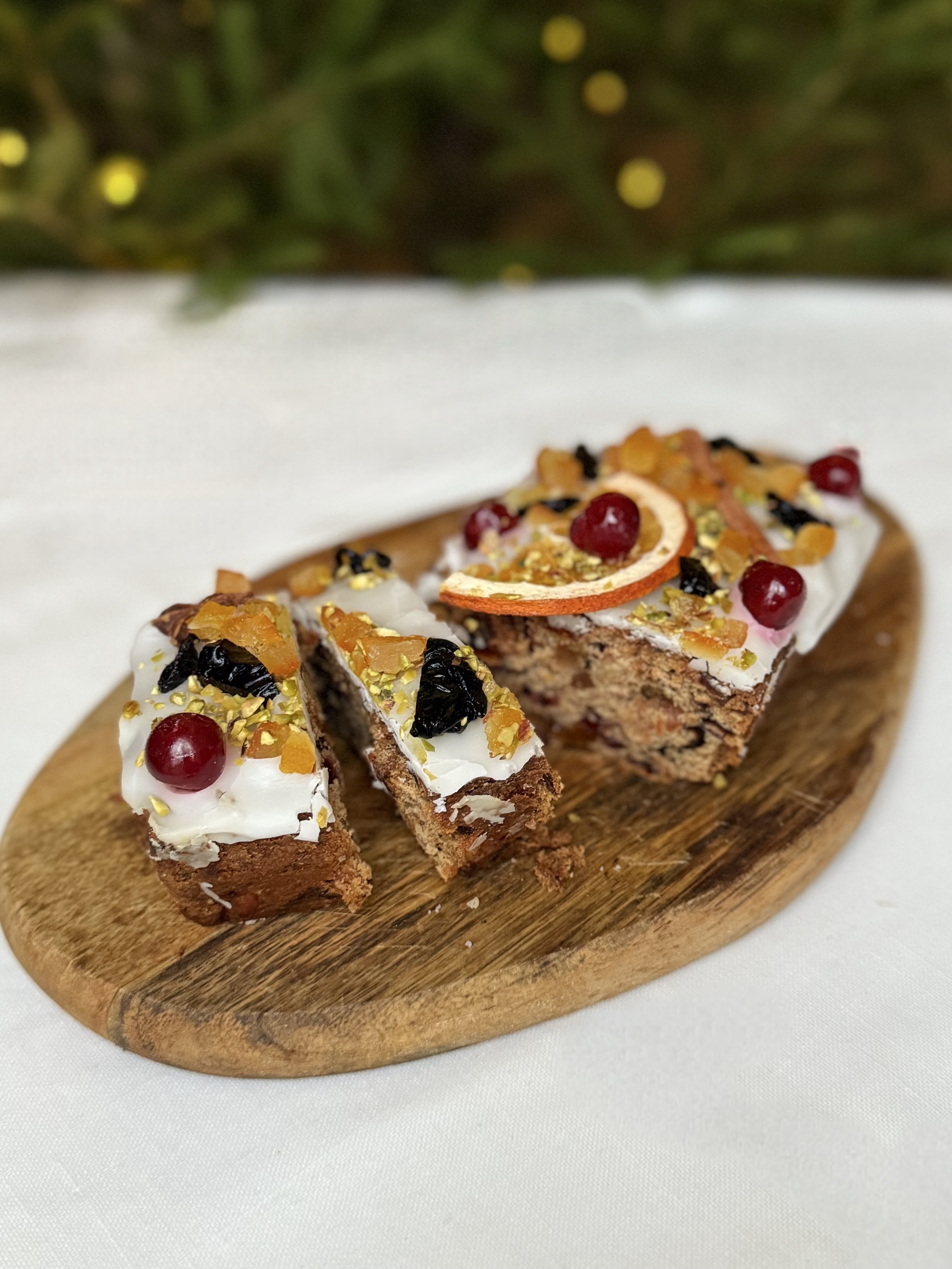 Состав: Смесь сухофруктов (изюм, курага, чернослив, коньяк, клюква вяленая, цукаты ), мука пшеничная цельнозерновая, масло сливочное 82,5%, цедра лимона, цедра апельсина, меланж яичный, сахар тростниковый, миндаль, ром, сахар песок, мед, орех мускатный, соль, имбирь молотый, корица молотая, ванилин, кардамон, бадьян, помадка белая, апельсин сушеный, курага, вишня засахаренная, чернослив, корица палочка, бадьян, фисташки