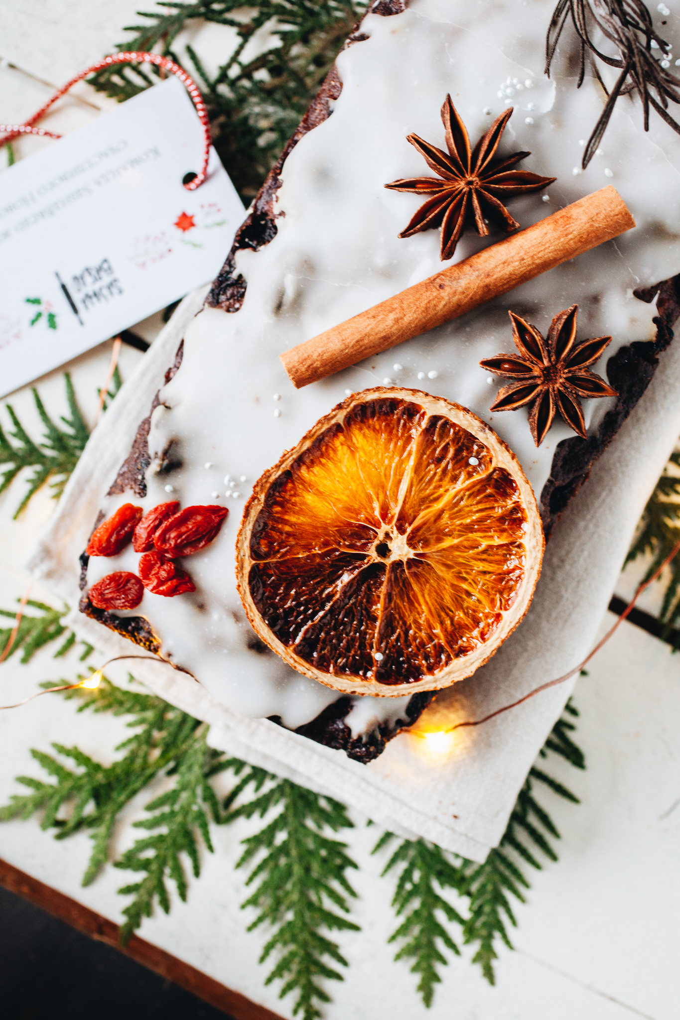 Состав: Смесь сухофруктов (изюм, курага, чернослив, коньяк, клюква вяленая, цукаты ), мука пшеничная цельнозерновая, масло сливочное 82,5%, цедра лимона, цедра апельсина, меланж яичный, сахар тростниковый, миндаль, ром, сахар песок, мед, орех мускатный, соль, имбирь молотый, корица молотая, ванилин, кардамон, бадьян, помадка белая, апельсин сушеный, курага, вишня засахаренная, чернослив, корица палочка, бадьян, фисташки