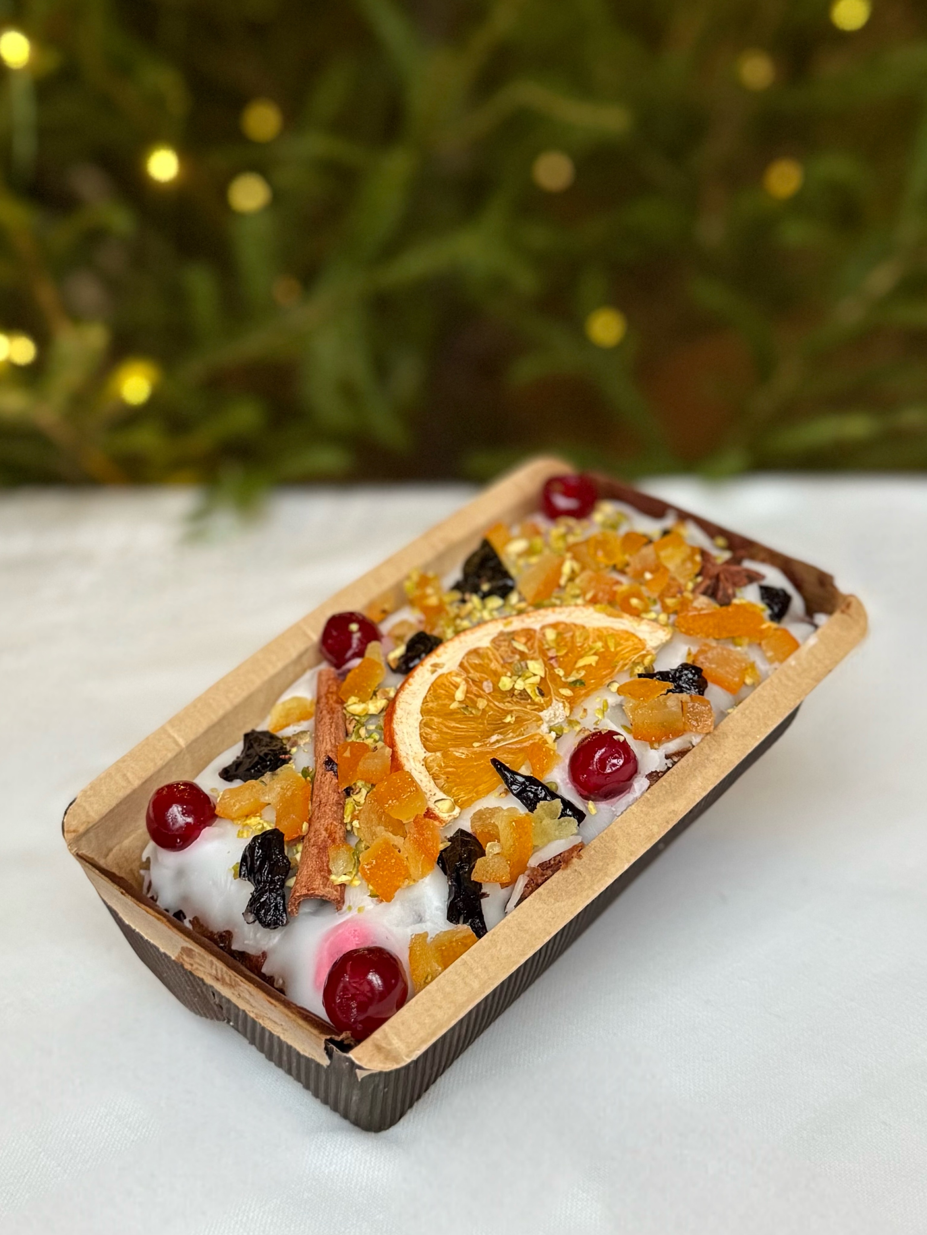 Состав: Смесь сухофруктов (изюм, курага, чернослив, коньяк, клюква вяленая, цукаты ), мука пшеничная цельнозерновая, масло сливочное 82,5%, цедра лимона, цедра апельсина, меланж яичный, сахар тростниковый, миндаль, ром, сахар песок, мед, орех мускатный, соль, имбирь молотый, корица молотая, ванилин, кардамон, бадьян, помадка белая, апельсин сушеный, курага, вишня засахаренная, чернослив, корица палочка, бадьян, фисташки