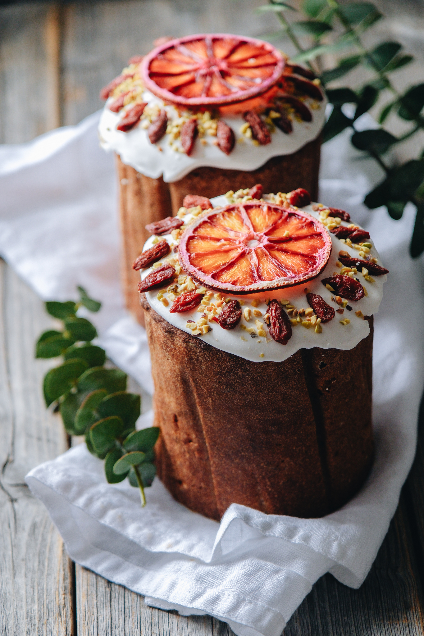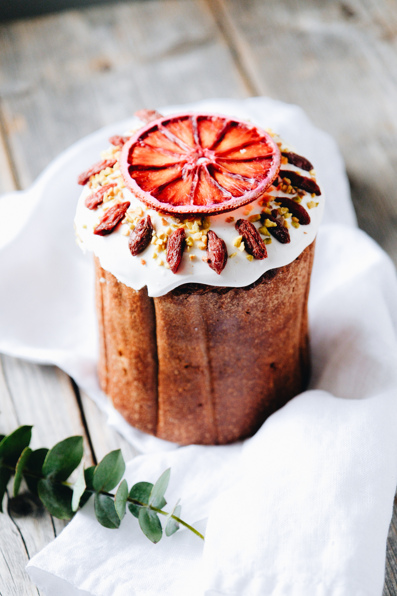 Состав: Овсяное молоко, смесь сухофруктов (изюм светлый сорта Голд, клюква вяленная, коньяк), рисовая мука, мука из зеленой гречки, финиковый сироп, гречишная закваска (мука из зеленой гречки, вода), Айсинг для покрытия (сахарная пудра, пастеризованный сухой белок куриного яйца, загуститель мальтодекстрин, картофельный крахмал, загуститель гуаровая камедь, ванилин, лимонная кислота, пищевой краситель), ванильная паста из стручков ванили сорта Бурбон, крахмал картофельный, ягоды Годжи, фисташка дробленная, крахмал тапиоковый, шелуха семян подорожника, апельсин сушеный, дрожжи хлебопекарные, кардамон, пекарский порошок, соль пищевая, ксантановая камедь.