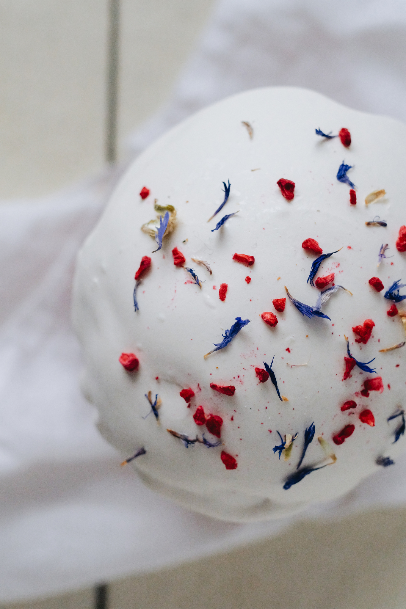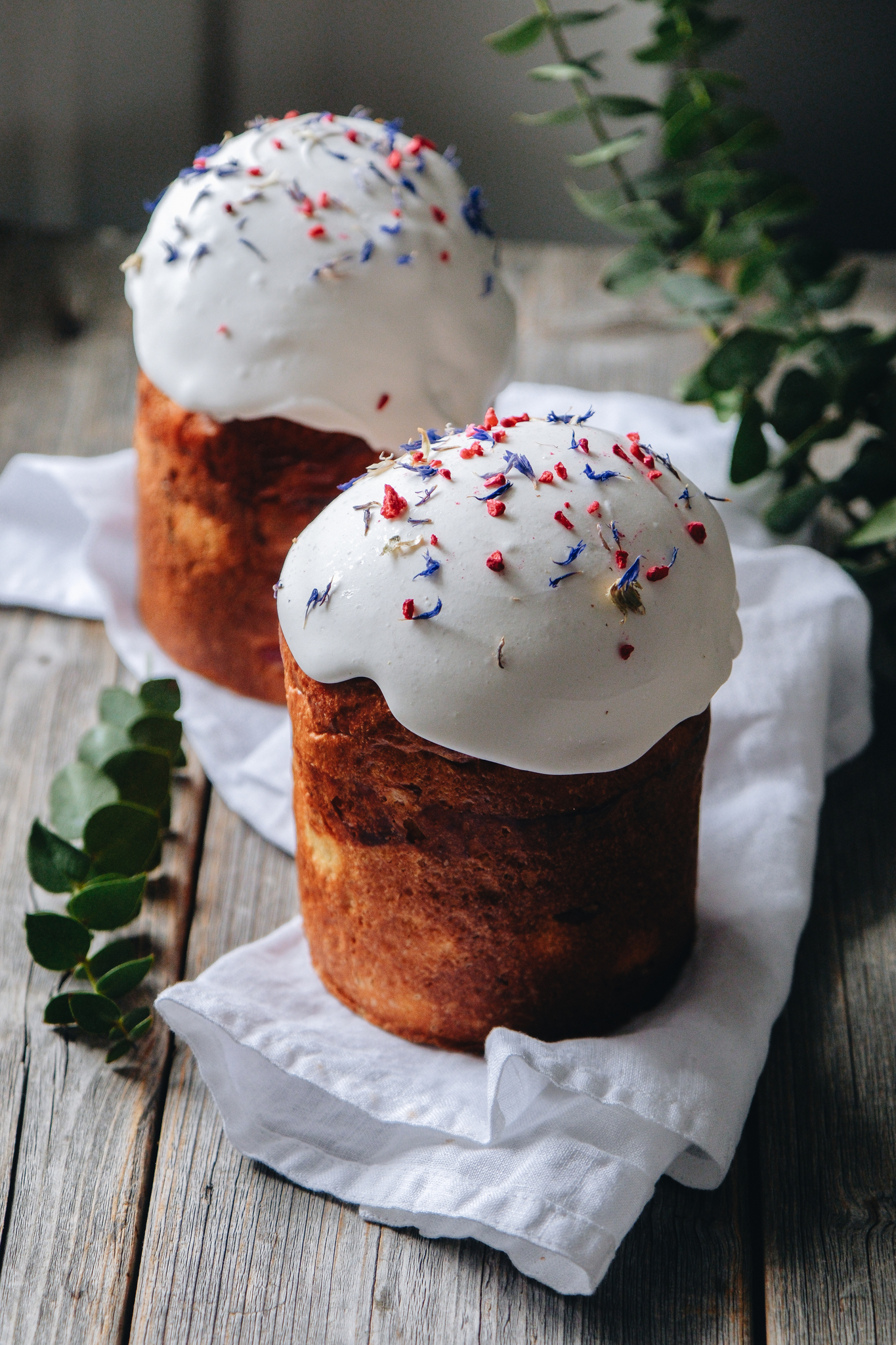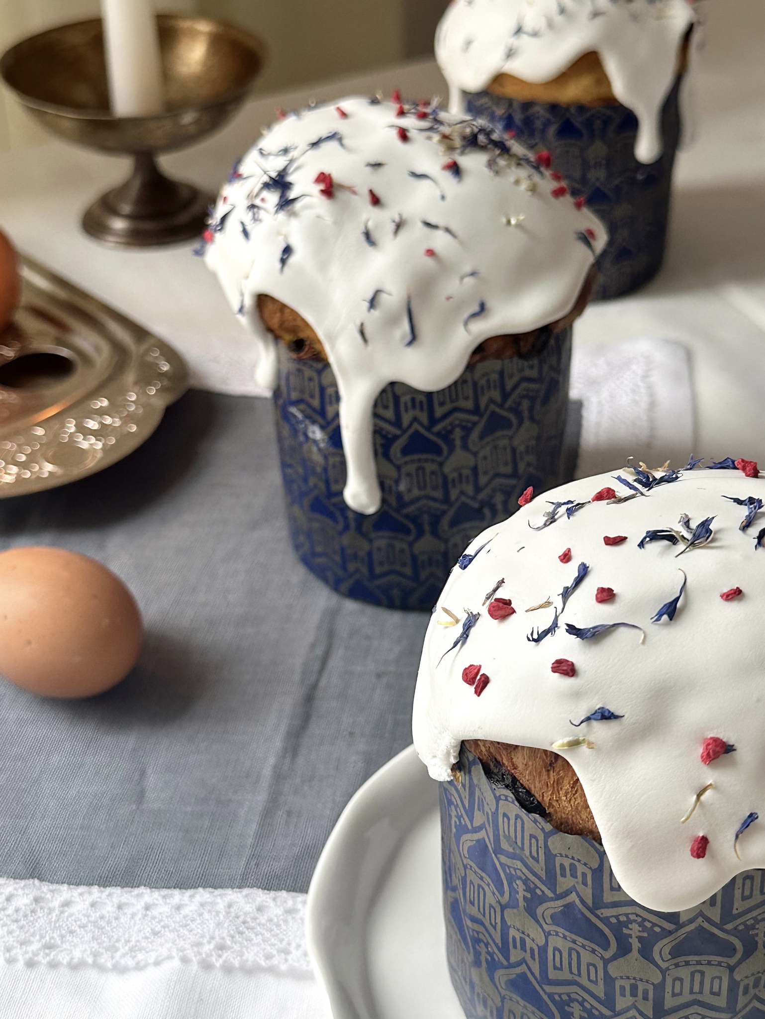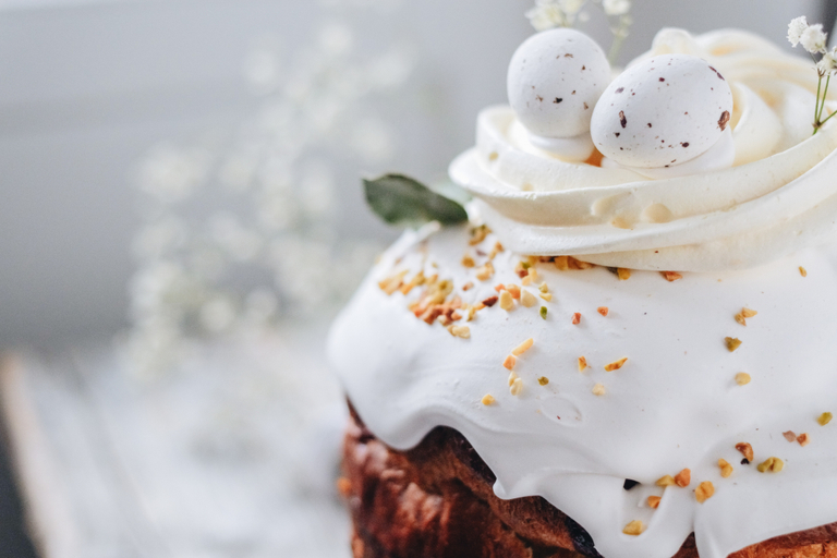 Описание: Традиционный кулич приготовлен только из натуральных ингредиентов, тесте изюм в коньяке, а также вяленая клюква. Кулич покрыт хрустящей глазурью, сублимированной малиной и цветами василька.