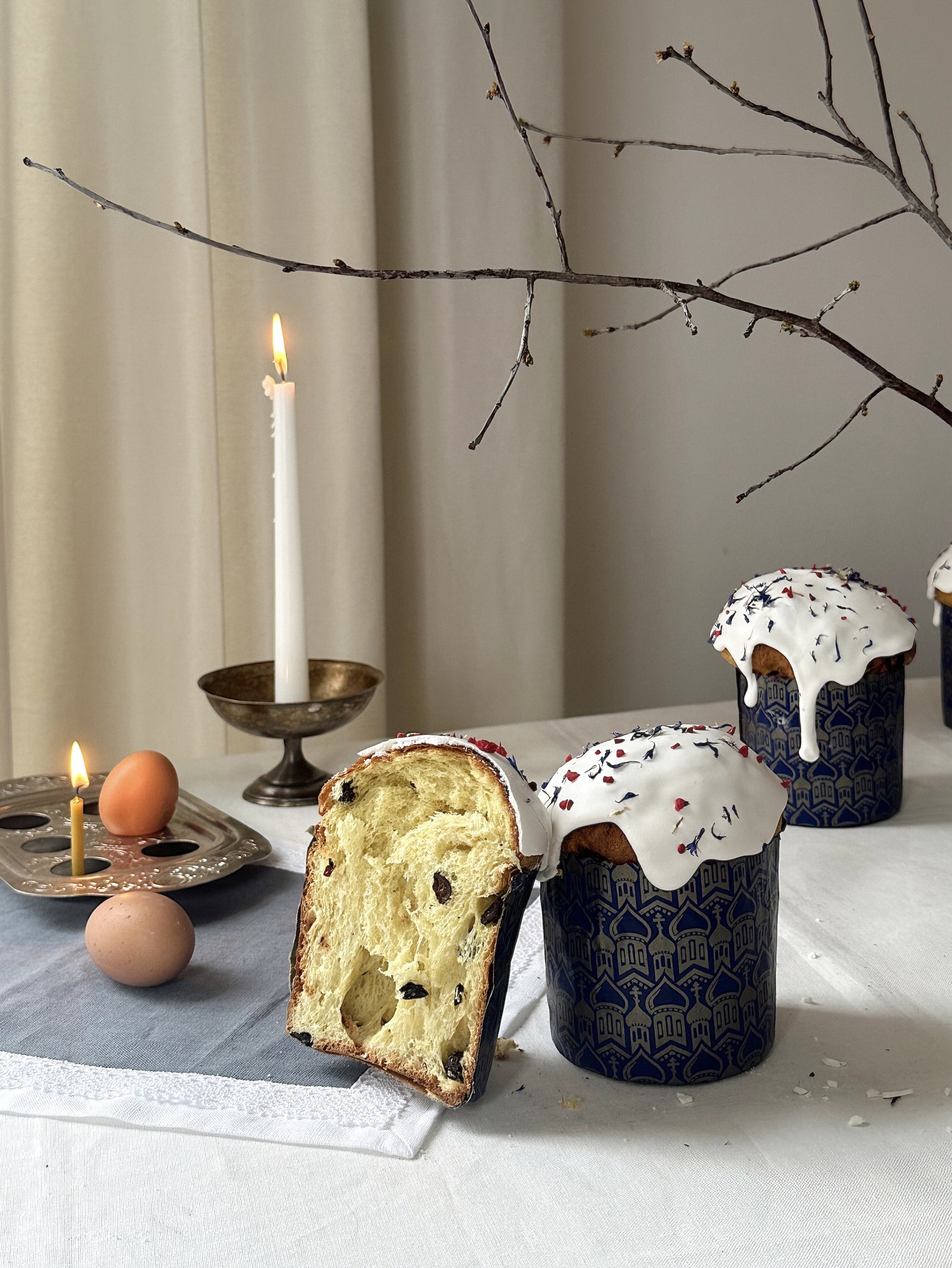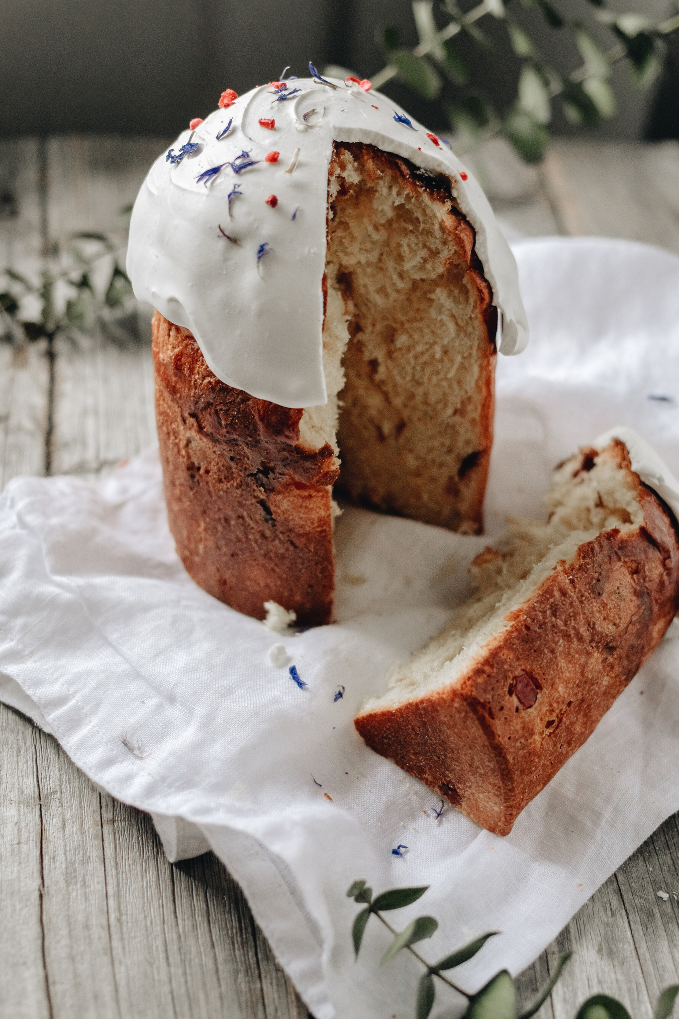 Состав: Мука пшеничная хлебопекарная высшего сорта, смесь сухофруктов (изюм светлый сорта Голд, клюква вяленная, коньяк), масло сливочное м.д.ж. 82,5%, молоко м.д.ж. 3,2%, сахар, меланж яичный, желток яичный, Айсинг для покрытия (сахарная пудра, пастеризованный сухой белок куриного яйца, загуститель мальтодекстрин, картофель- ный крахмал, загуститель гуаровая камедь, ванилин, лимонная кислота, пищевой кра- ситель), ванильная паста из стручков ванили сорта Бурбон, дрожжи хлебопекарные, соль пищевая, кардамон, куркума, сублимированная малина, шафран, цветы василька.
