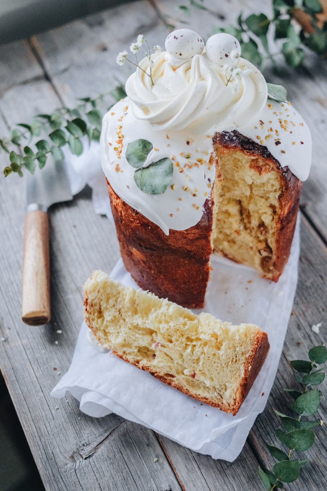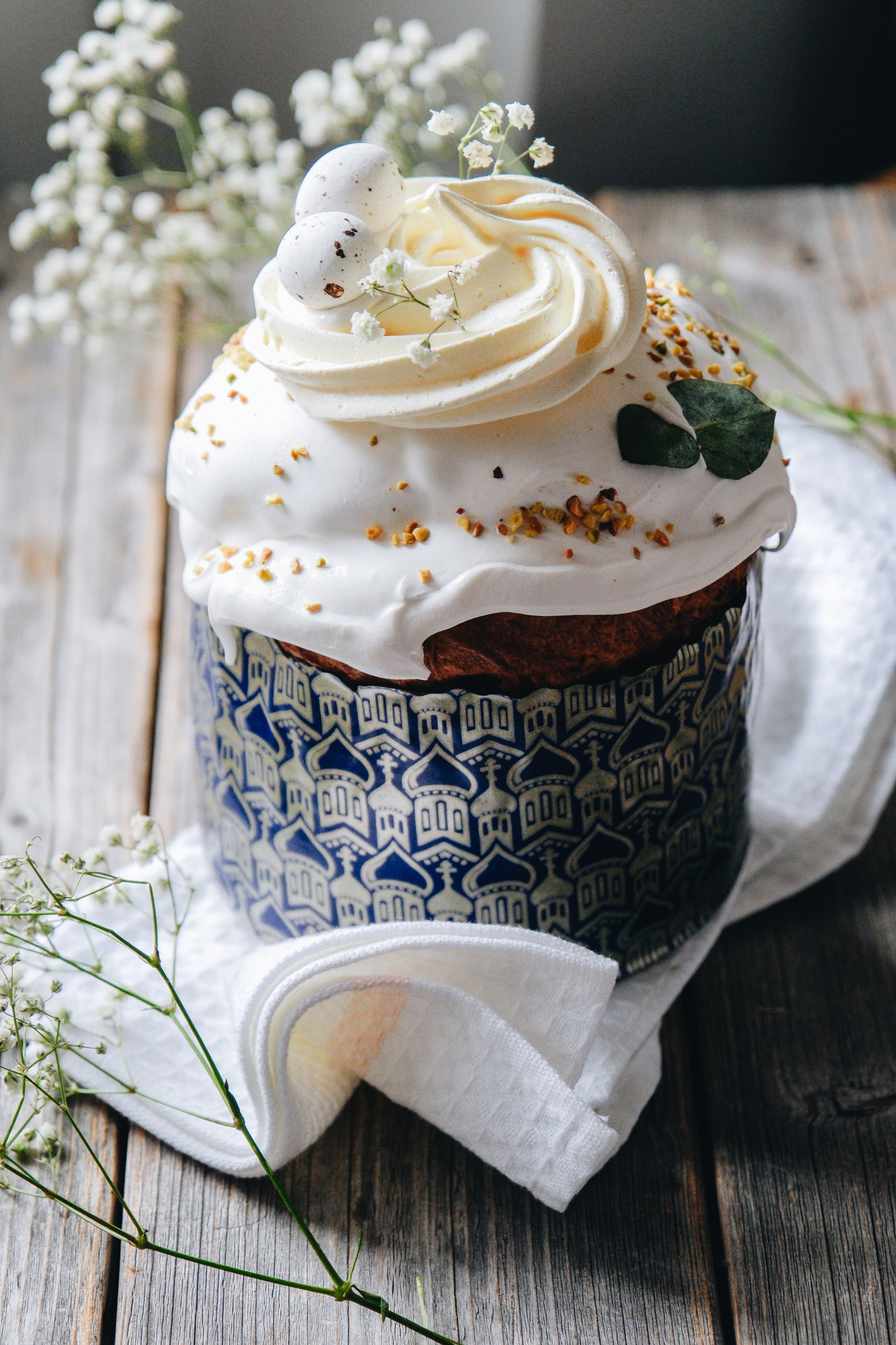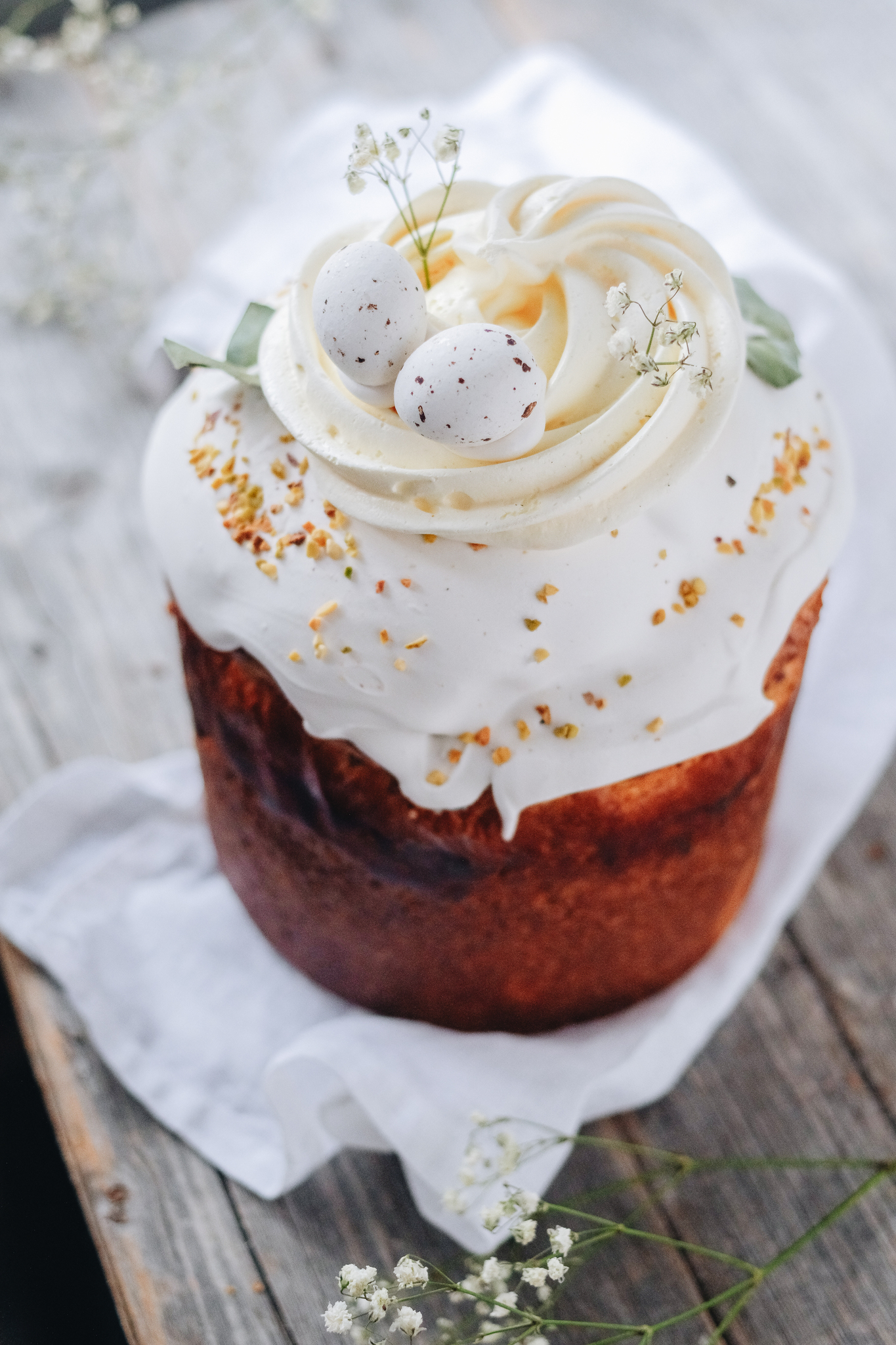 Описание: Праздничный кулич в нарядной упаковке приготовлен из натуральных ингредиентов, в тесте изюм в коньяке, а также вяленая клюква. Кулич покрыт хрустящей глазурью, безе и шоколадными яйцами. Порадуйте себя и близких в светлый праздник Пасхи!